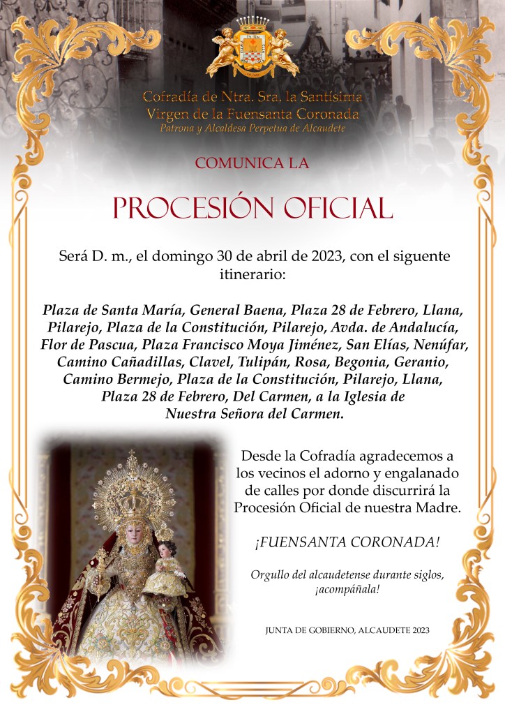 La Junta de Gobierno de la Cofradía de Nuestra Señora de la Fuensanta Coronada comunica el recorrido de la Solemne Procesión Oficial de Nuestra excelsa Patrona.