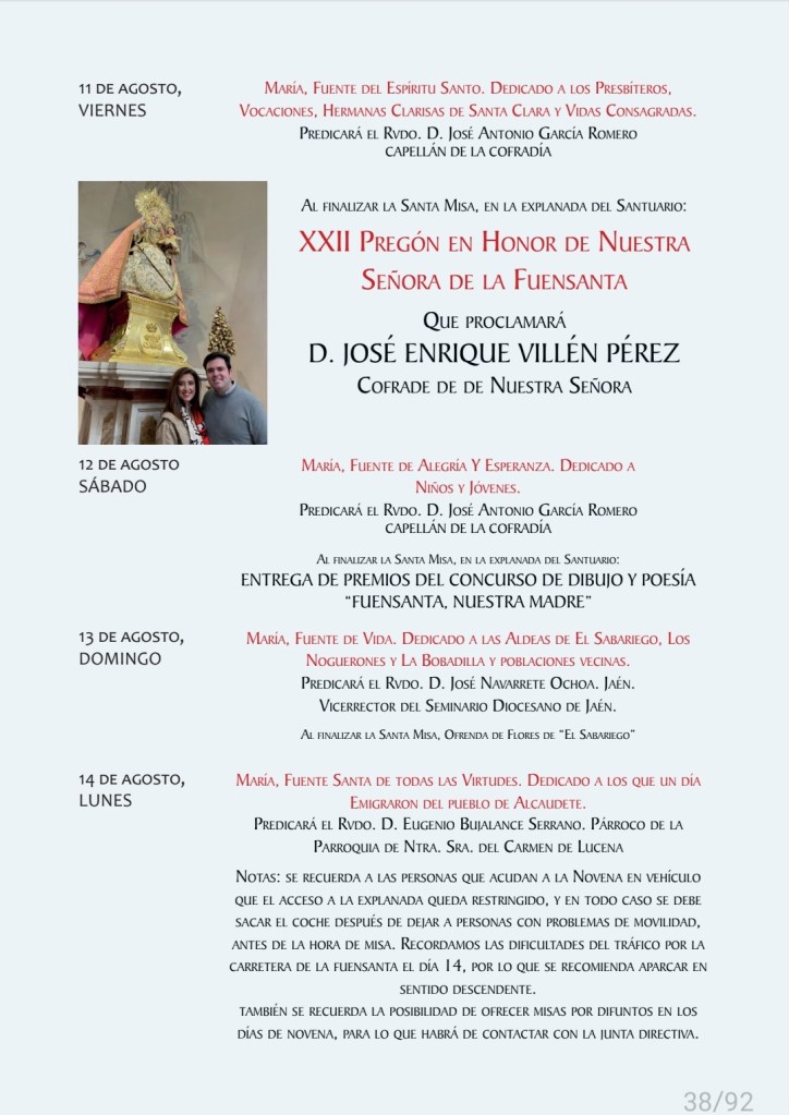 A las puertas de un nuevo agosto, hacemos pública la que será la programación de la Novena 2023, con la secuencia de la dedicación de cada día y los sacerdotes que predicarán cada día.