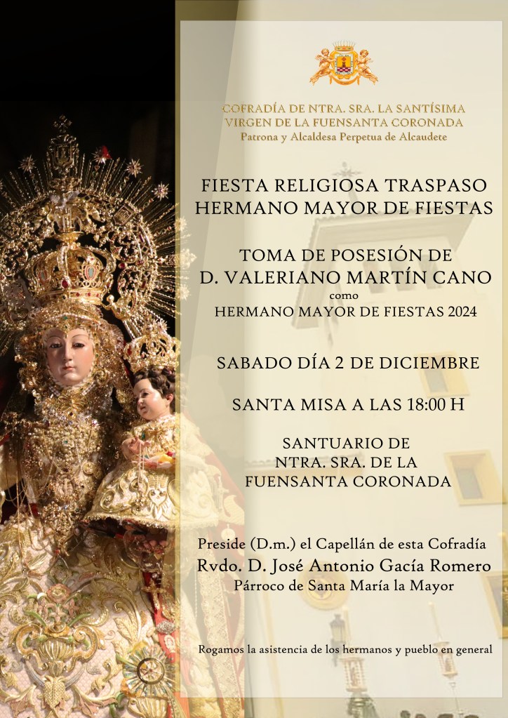 El próximo día 2 de diciembre a las 18:00 h tendrá lugar en el Santuario de Nuestra Señora la Santísima Virgen de la Fuensanta Coronada la celebración de la Eucaristía, y la toma de posesión como nuevo Hermano Mayor de Fiestas del próximo año 2024 de D. Valeriano Martín Cano, devoto de Santísima Virgen y hermano de la Cofradía.