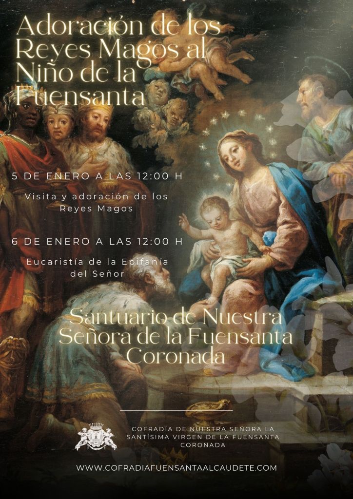 El próximo 5 de enero de 2024 a las 12:00h recibiremos la visita de sus majestades, los Reyes Magos, en el Santuario de la Virgen de la Fuensanta Coronada, donde adorarán al Niño Dios y le pedirán por todos los niños y niñas de Alcaudete.