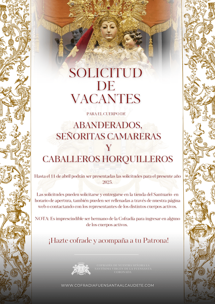 #𝐕𝐀𝐂𝐀𝐍𝐓𝐄𝐒 • Hasta el próximo 11 de abril, está abierta la solicitud para optar a los cuerpos activos de la Cofradía de la Virgen de la Fuensanta.