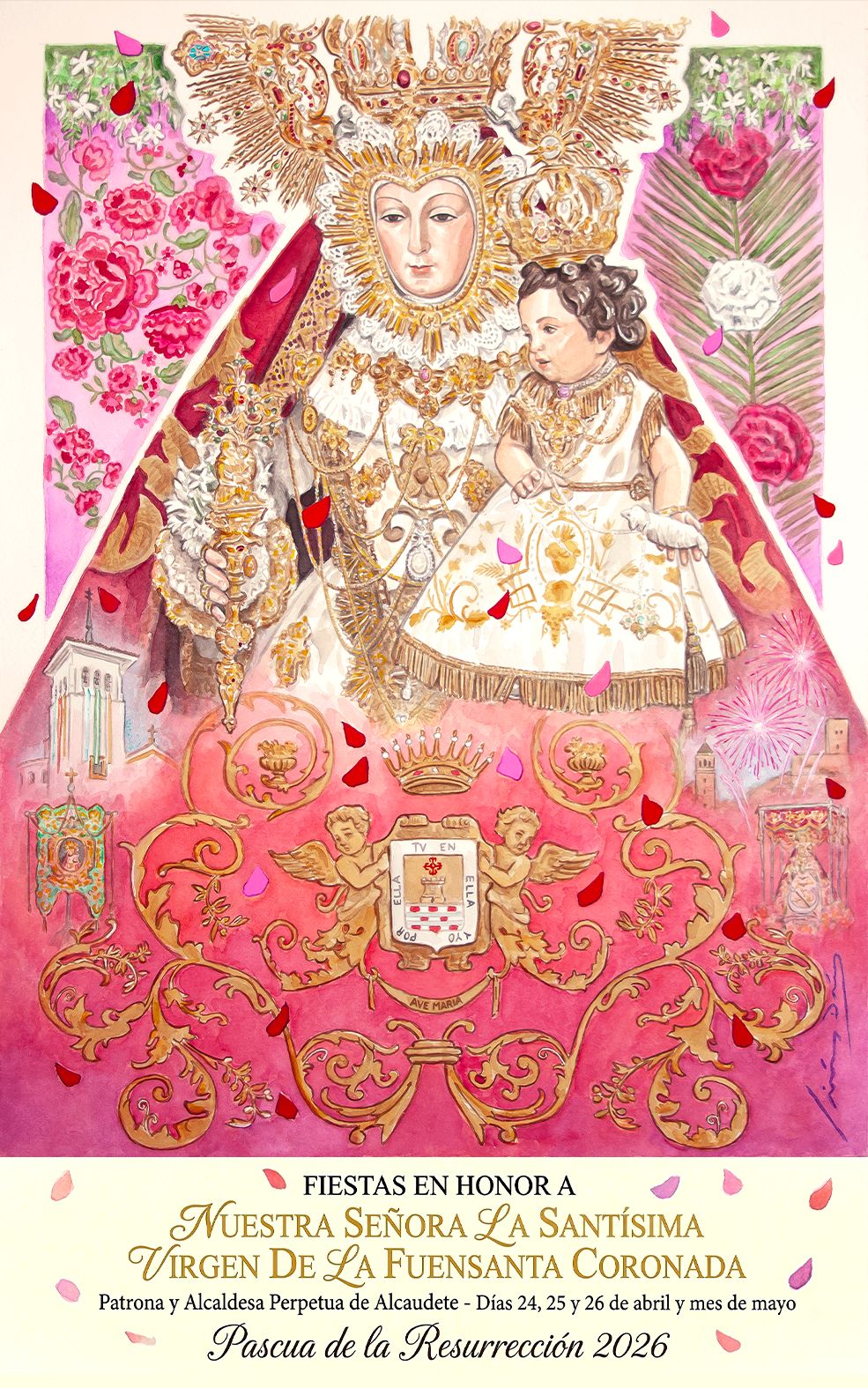 Por último, los pétalos que le van tirando a la Virgen a su paso durante todo el recorrido caen sobre el cartel como muestra de cariño de sus hijos. Los tonos alegres como el rojo, rosa y morado que cubren el campo en la primavera dominan en cartel, haciendo que destaquen entre ellos la blancura y pureza de la Virgen de la Fuensanta y su Santísimo Hijo, anunciando así esta obra las Fiestas en Honor a Nuestra Señora la Santísima Virgen de la Fuensanta Coronada, en la Pascua de Resurrección 2026, en una nueva primavera.
