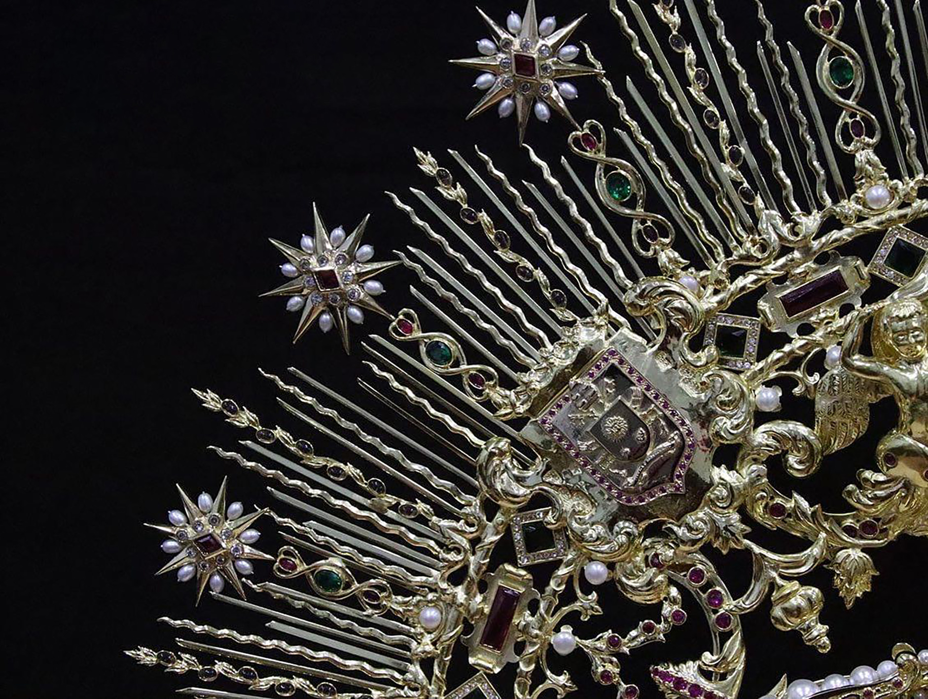 Esta media luna es otro de los diseños de D. Álvaro Abril para el ajuar de Coronación de la Virgen de la Fuensanta que ha ejecutado también D. Manuel Valera. Las estrellas salpican las piedras cristalinas en alusión al agua de la Fuensanta. Se trenza sobre ella ramas de olivo con el fruto de esta tierra de Jaén, y en el medio la Cruz de Calatrava, por su vínculo histórico con Alcaudete. Ha sido donada por su Camarera Mayor.