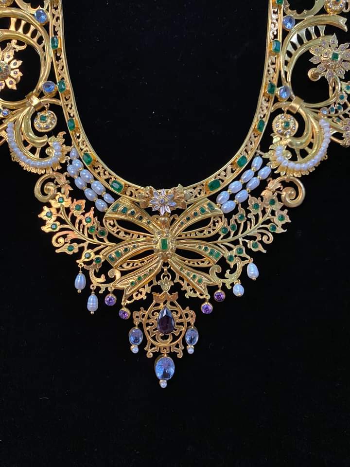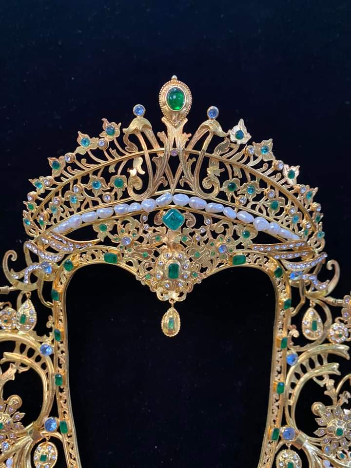 Lleva engarzadas piedras naturales de tipo esmeraldas, aguamarinas, brillantes amatista y perlas. Sus laterales son tembladeras continuando la línea isabelina de los pendientes y aderezos antiguos, al igual que el lazo que cierra el cuello. Donación realizada a la Santísima Virgen de la Fuensanta por D. Mario Ordóñez y D. Miguel Ángel Damas.
