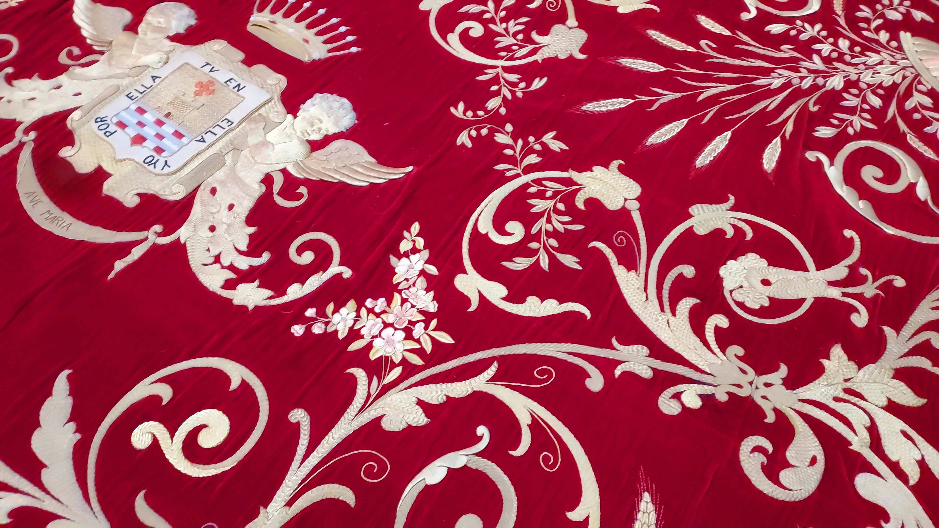 Manto de camarín confeccionado en damasco rojo y brocado con hilo de oro reproduciendo estilizados motivos vegetales. La calidad del tejido es espléndida, con un sutil labrado que le aporta dos tonalidades de rojo. El brocado en oro combina grandes haces de flores con otras más pequeñas, todo enlazado con curvilíneas cadenetas también vegetales. Incluye un encaje de maya calado por todo su perímetro. La impresión general es de una extraordinaria belleza visual y táctil.