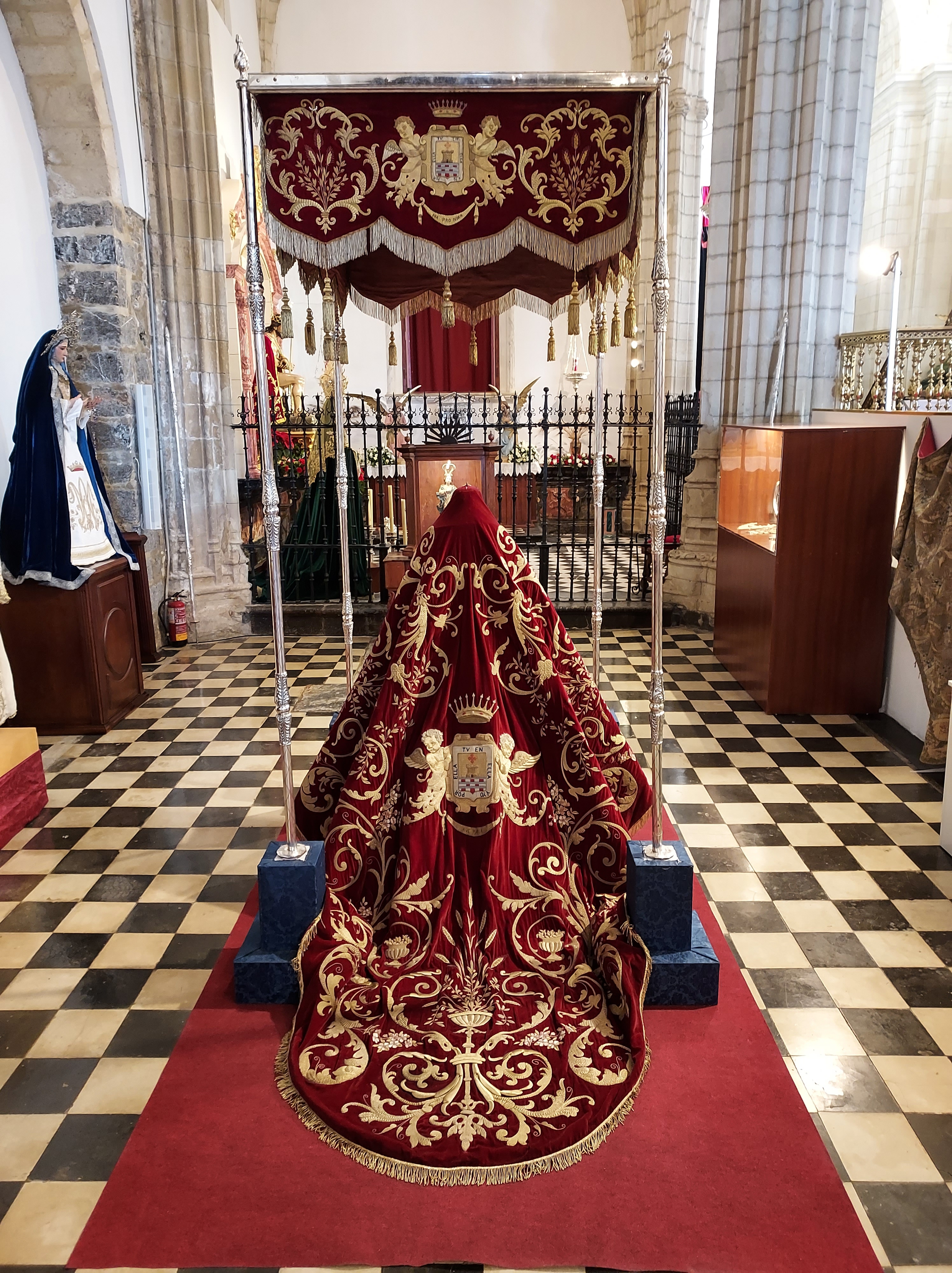 Manto de terciopelo burdeos bordado en oro regalado a la Virgen por la aceitera «Casa Manuel Funes e Hijos» en 1949.