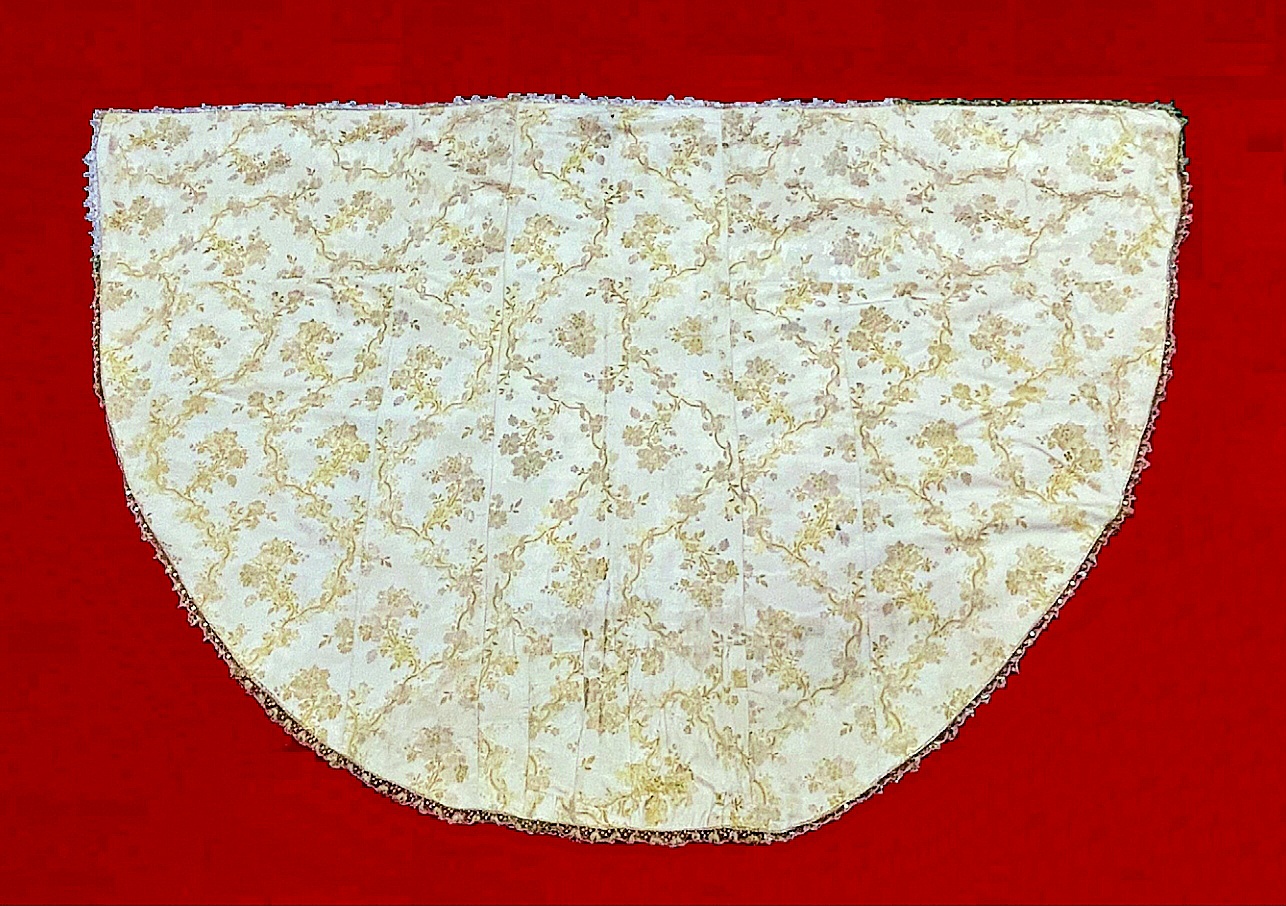Manto de camarín de seda de color marfil, brocado de hilo de oro, datable en el último cuarto del siglo XVIII. De gran elegancia, toda su superficie está cubierta por una tupida decoración vegetal a base de estilizados ramos terminados en flores menudas. Incluye un encaje perimetral de hilo de oro.