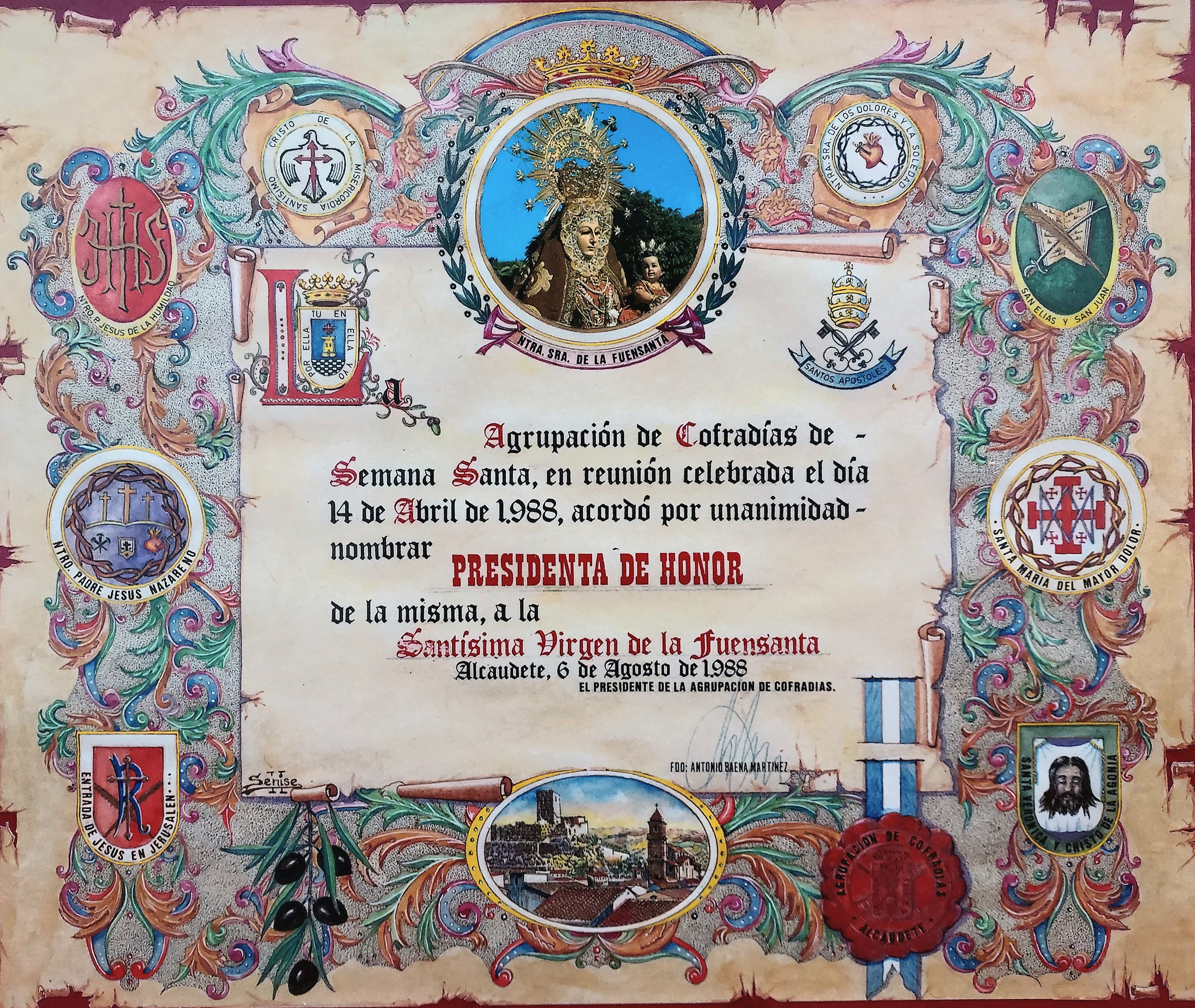 «Agrupación de Cofradías de Semana Santa, en reunión celebrada el día 14 de abril de 1988, acordó por unanimidad nombrar Presidenta de Honor de la misma, a la Santísima Virgen de la Fuensanta.»