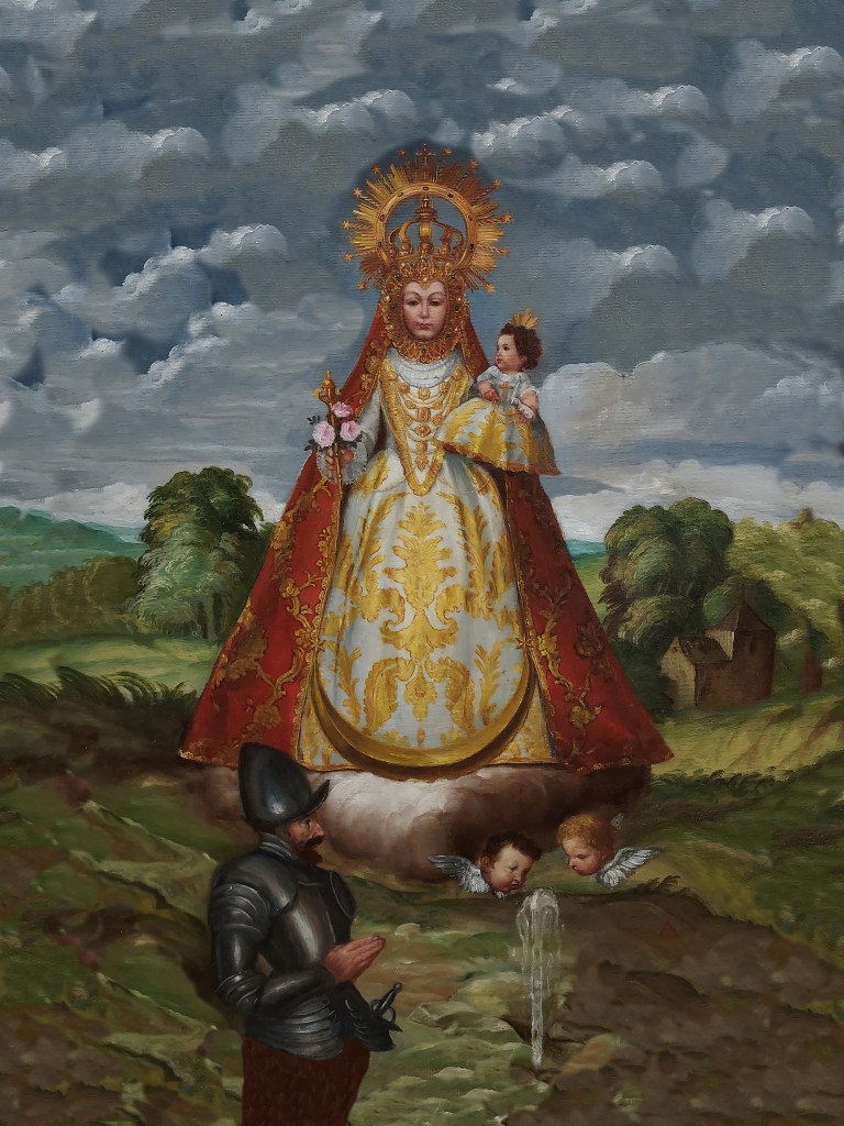 Durante la reconquista del Reino de Granada, un soldado cristiano que se encontraba en una batalla a los pies de la Sierra Ahillos resultó gravemente herido por el ejército musulmán. El soldado, temiendo por su vida, huyó del campo de batalla, resguardándose en un hueco del terreno para protegerse de los musulmanes que lo perseguían, atemorizado, comenzó a rezar e implorar la protección maternal de María, aun orando, una mujer vestida de blanco se apareció y, haciendo brotar un manantial de sus plantas, dijo al soldado que limpiara con ese agua sus heridas, quedando estas milagrosamente sanadas. Una vez pasados los conflictos, en el lugar del prodigioso milagro, el pueblo de Alcaudete levantó una pequeña ermita, donde comenzó a venerarse a la Virgen de la Fuente Santa, estando esta ya construida en 1511, cuando se tiene la primera referencia sobre ella.