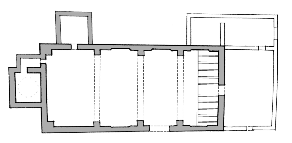 La nave poseía tres tramos abovedados, bien articulados mediante el resalte de las pilastras perimetrales, disponiéndose en las paredes ligeros rehundimientos, a modo de hornacinas, para distintos altares y, a los pies, un pequeño coro en alto configurado mediante un forjado de madera. Adosada al presbiterio, por el lado derecho, se situaba una sacristía de planta cuadrada. Todo el edificio se cubría con un tejado conformado por una sencilla estructura de palos rollizos de madera